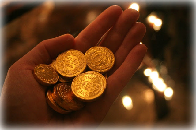 The kids woke up to an extra special treat this morning. Last night I told them the legend of St. Nicholas celebrated on the eve of Dec. 5th in some European countries. They left their boots on the stairs and were pleased to see them filled with treats in the morning. The coins were a huge hit!